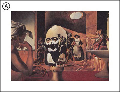 Рисунок 3. Изображение A: Картина Сальвадора Дали "Рынок невольников с исчезающим бюстом Вольтера" (1940), представляет зрителю двусмысленное изображение мальчиков в хоре в арке которых также можно увидеть как лицо известного французского писателя-философа.
