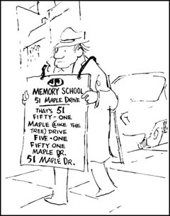 Рисунок 7. Помнить, где мы уже побывали, что делаем и где мы находимся может (для некоторых из нас) быть сложным подвигом и в нашей ежедневной жизни. (подпись на карикатуре: "Школа памяти, Мэпл Драйв 51, это 51, пять - один, улица Мэпл (как дерево), пять - один, Мэпл драйв, 51 Мэпл драйв")